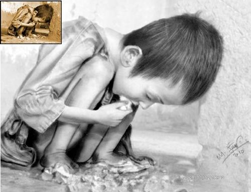 Aç çocuk resimleri,yoksulluk,fakirliği anlatan karakalem çalışmam,üstü başı yırtık elbiseli,topraktaki ekmek kırıntılarını yiyen çocuk,siyah beyaz fotoğraftan çalışıldı,kara kalem,en iyi malzemeler kullanıldı,